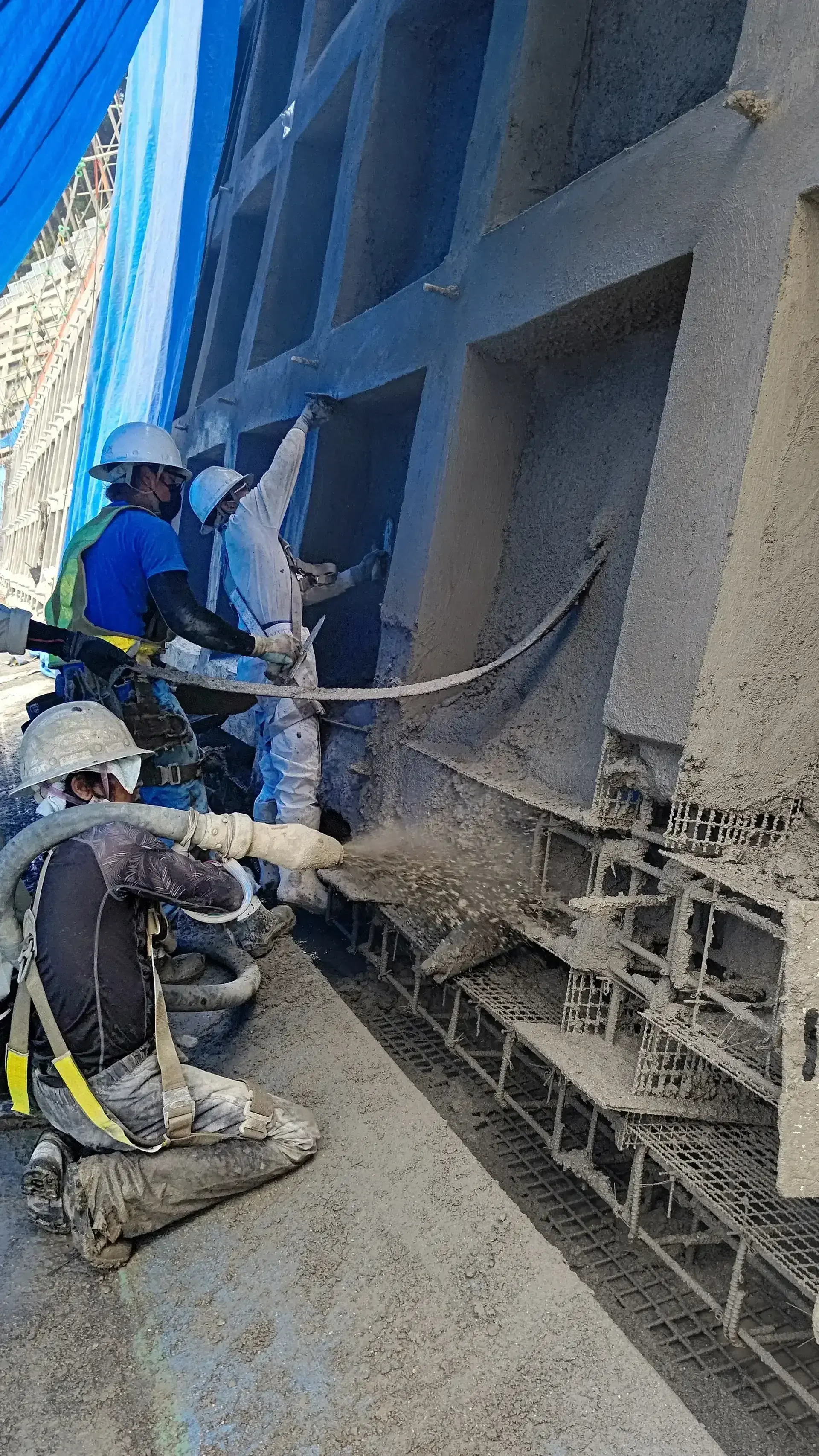 作ったフリーフレームの型枠に特殊な機械でゴムホースを使い吹き付けて型枠を仕上げていきます。吹付作業と並行して仕上げにコテを使う場合も有ります。