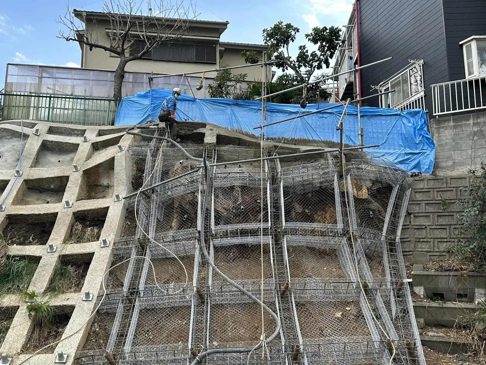 格子状に作った型枠の中に現場により緑化するために種を入れた土を吹き付けたりモルタルを吹き付けて後片付けをして完成です。